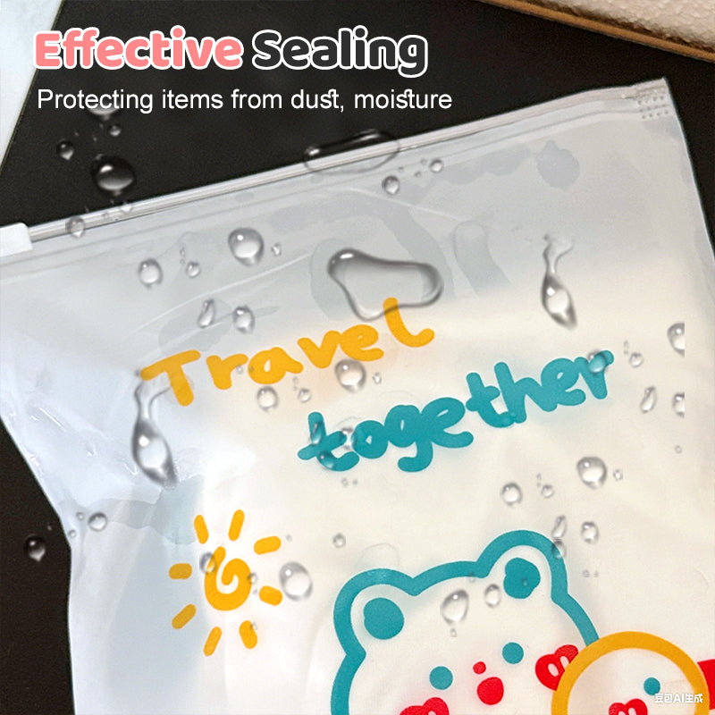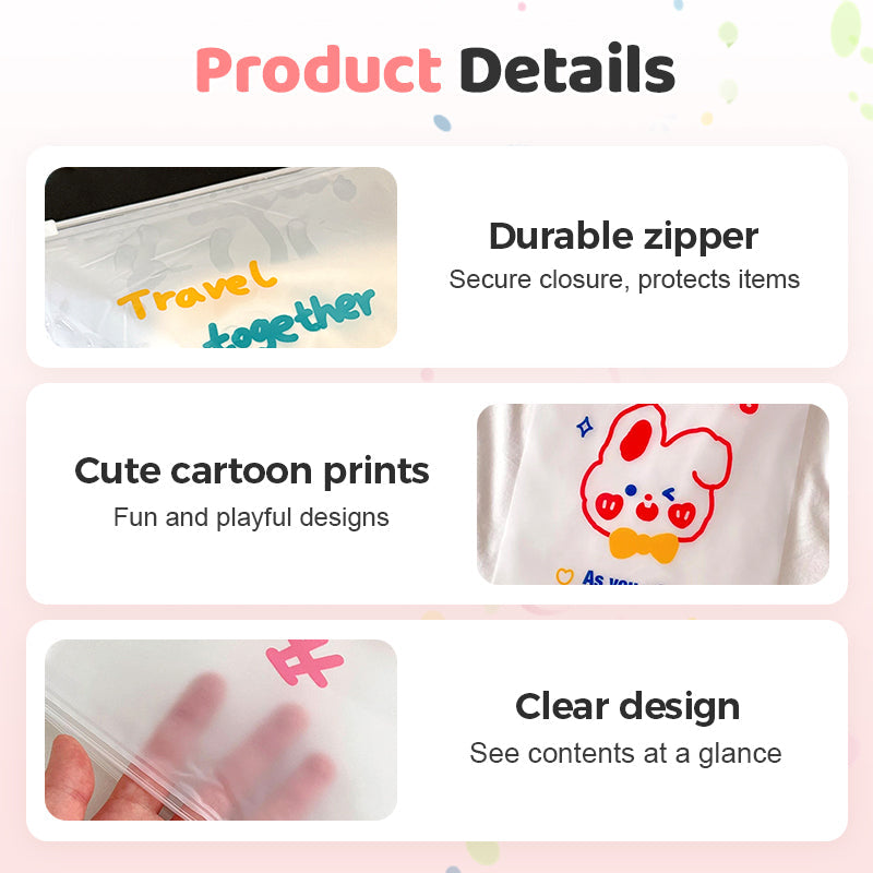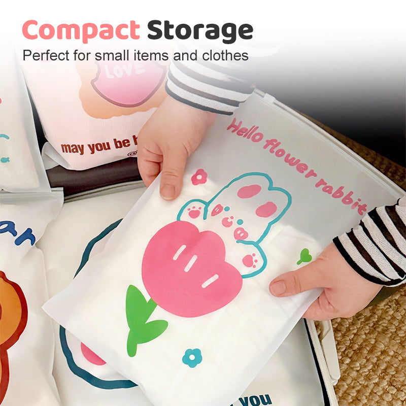 STAMPE DEI CARTONI ANIMATI – Ogni busta presenta divertenti e vivaci disegni cartoon su uno sfondo completamente trasparente in materiale PE, aggiungendo un tocco allegro all’organizzazione quotidiana. Le stampe simpatiche rendono facile identificare gli oggetti e piacciono a bambini, studenti e chiunque apprezzi un’estetica vivace. Perfette per organizzare piccoli capi di abbigliamento, giocattoli, cancelleria o articoli da viaggio, queste buste combinano funzionalità e stile visivamente accattivante.
