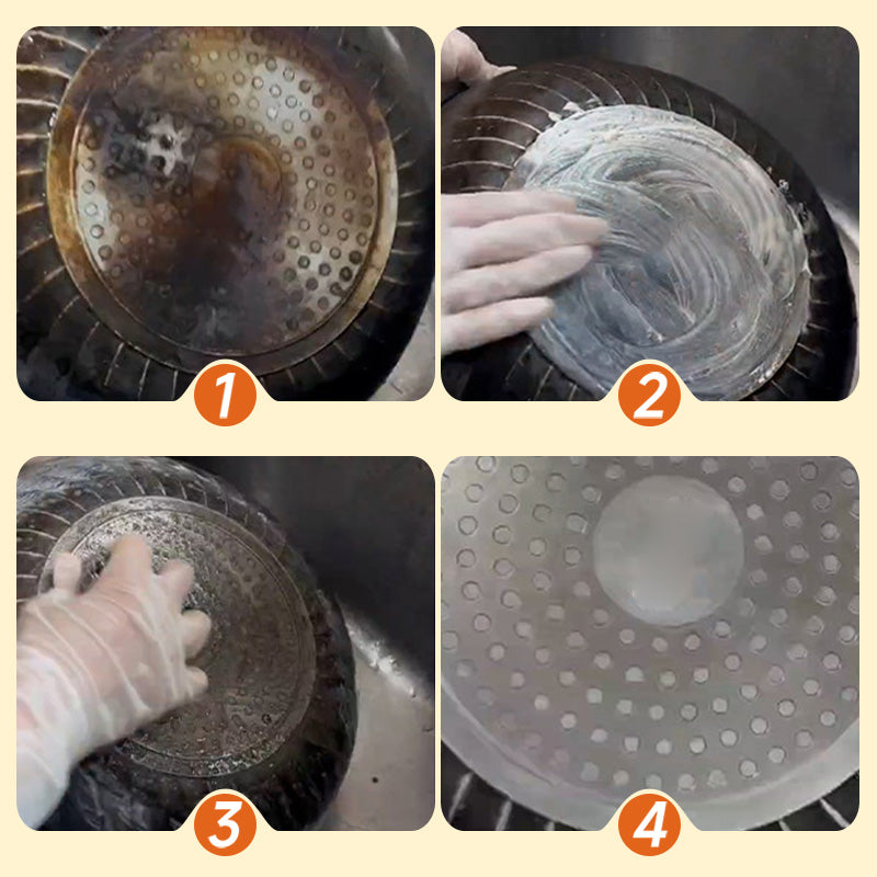 FACILE DA USARE: Basta bagnare la pentola unta, applicare uniformemente la pasta, strofinare con una palla di lana d'acciaio e risciacquare con acqua—senza residui.