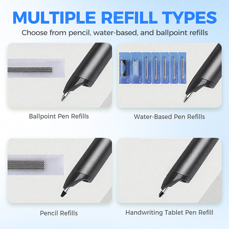 DIVERSE OPZIONI DI RICARICA – 5 ricariche per matita, 10 ricariche a inchiostro a base d’acqua, 3 ricariche a sfera e 1 ricarica per tablet di scrittura. Perfette per scrivere, disegnare o fare schizzi: ogni opzione è progettata per una compatibilità impeccabile con la tua penna intelligente.