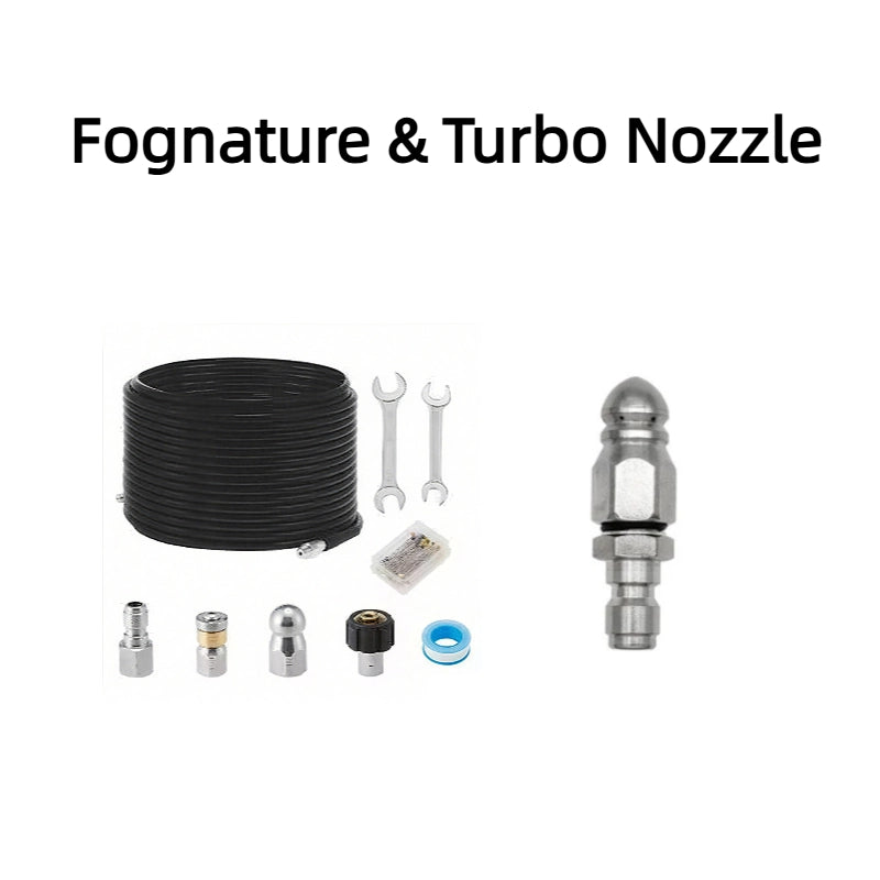 KIT COMPLETO PER IL LAVAGGIO CON Getto D'Acqua AD ALTA PRESSIONE – Include tutti gli accessori necessari per l'uso immediato, come ugelli, raccordi e un tubo flessibile resistente, rendendolo una soluzione completa per tutte le esigenze di pulizia di scarichi e tubature.